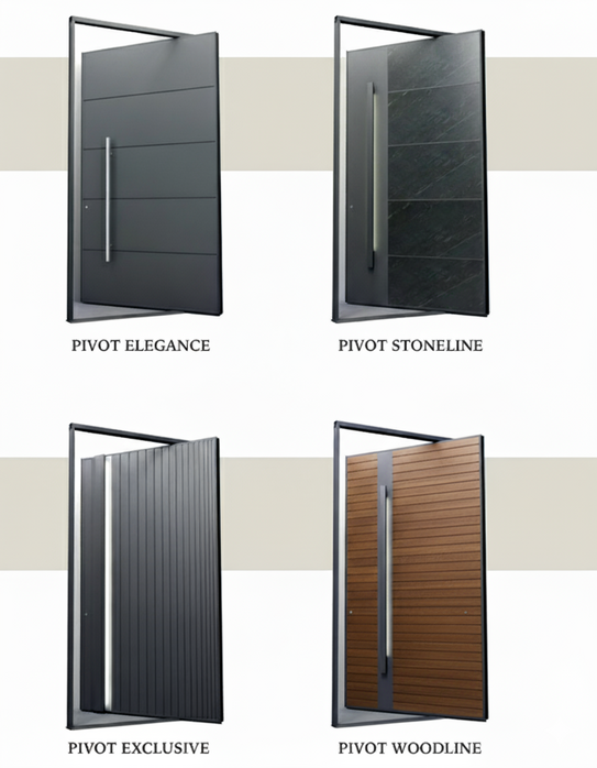 Architectural Statement: Beyond mere functionality, our Pivot Doors serve as a bold design element, available in a variety of exquisite finishes like the sleek PIVOT ELEGANCE, the robust PIVOT STONELINE, the textured PIVOT EXCLUSIVE, and the warm PIVOT WOODLINE.
