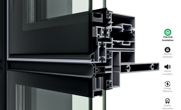 The FS-72 is a cutting-edge system developed for façades that require wide glass surfaces. This is achieved through its minimal-looking cover design which seamlessly integrates high-performance thermal insulation.